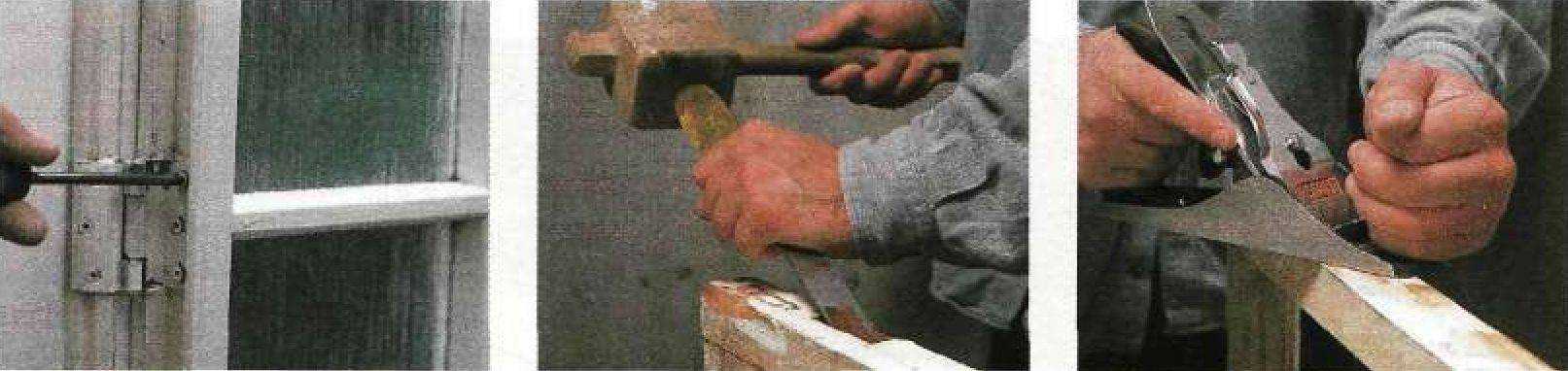 Иногда деревянные створки, установленные на петли, могут деформироваться, так что нормально они будут заходить в проем рамы только сверху или снизу. Самый лучший способ исправить положение — установить в такую створку несколько врезных оконных запоров, для которых в створке необходимо будет вырезать выемки, а для запирающих ригелей (засовов) также выбрать пазы в раме. Это обеспечит удержание створки в правильном положении (попросите кого-нибудь прижать створку снаружи, пока вы будете запирать ее на засов), и поведенные места таким образом выправятся самостоятельно.