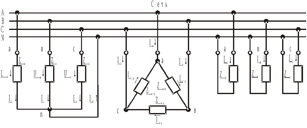 Если объединить распространённые типы включения в трёхфазную сеть, можно увидеть следующую картину.