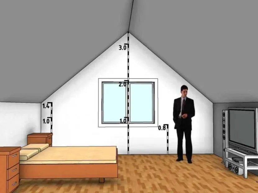 - Высота превышает 1,5 м. На расстоянии полуметра от стены вы сможете передвигаться, не боясь задеть головой наклонную плоскость. Такие помещения считаются полноценными для круглогодичного проживания. Если комната при планировке получается маленькой для гостиной, ее можно отдать под кабинет или уютную спальню.