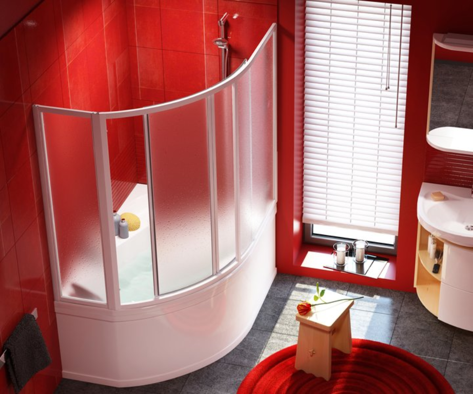 В нерабочем виде шторка располагается, как правило, у стены, и не занимает много места. При необходимости принятия душа такой механизм очень просто раскладывается, а затем также просто сдвигается на свое исходное место. Такой тип тоже очень полезен для небольшого пространства.