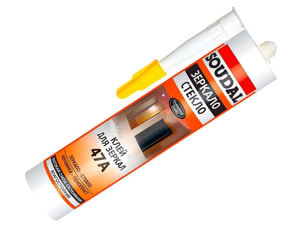Soudal 47А – производитель Бельгия. Это клей для зеркала на стену содержит синтетический каучук и смолы. Отличается высокой прочностью, влагостойкостью, быстро застывает и не повреждает зеркало. Хорошо взаимодействует со многими поверхностями, подходит для ванны.