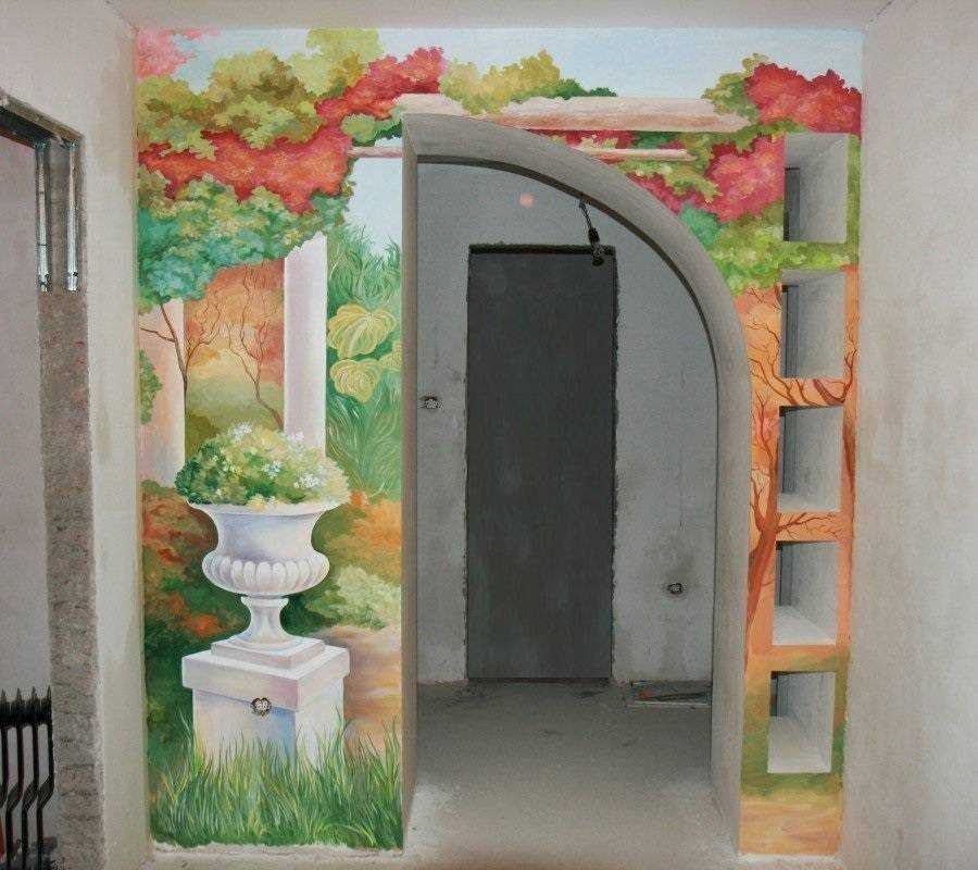Помимо сложных отделочных материалов, которые требуют монтажа, не стоит сбрасывать со счетов и более простые и доступные способы оформления. Возможно, вы прекрасно рисуете. Тогда почему бы не изобразить вокруг дверного проема какой-нибудь рисунок? Это может быть что угодно – и декоративная лиана с шикарными цветами, и просто повторяющийся по контуру орнамент, и те же кирпичики, но нарисованные. Главное, чтобы рисунок подходил под интерьер.