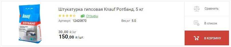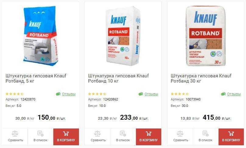 Детальную ценовую политику гипсовой штукатурки и описание к товару можно найти в каталоге товаров на официальном сайте Леруа Мерлен. Возле каждого товара указана цена как за 1 кг, так и за мешок. Упаковки предлагают весом 5, 10, 30 кг. Стоимость их в зависимости от веса – 150-415 рублей за мешок.