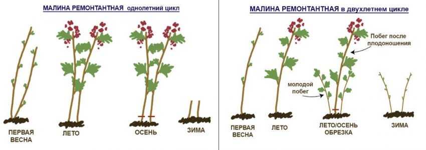 У обычных сортов обрезка стимулирует развитие побегов двухгодичных ветвей. Это делают для того, чтобы сорт не выродился. У ремонтантной малины плодоносят растения-первогодки.