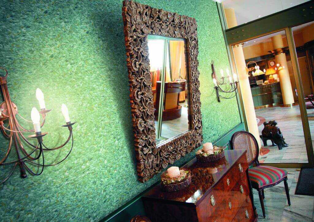 Фактурная декоративная штукатурка. Отличается экологичностью, легко может скрыть все недостатки стены, не нужны предварительные подготовительные работы. Может придать любой стене вид дерева или керамогранита, шёлка или бархата.