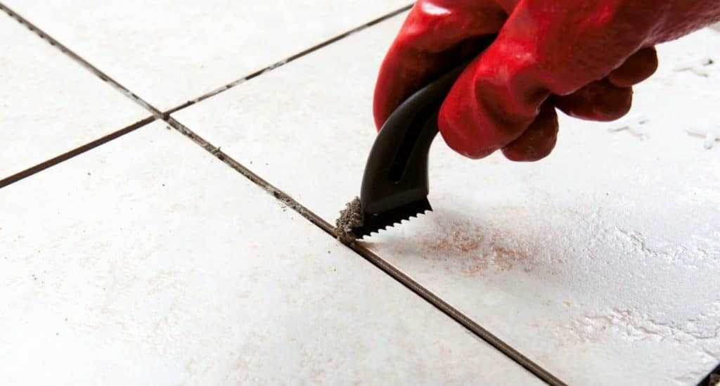 - При помощи шпателя или строительного ножа удаляется затирка, используемая для заполнения межплиточных швов.