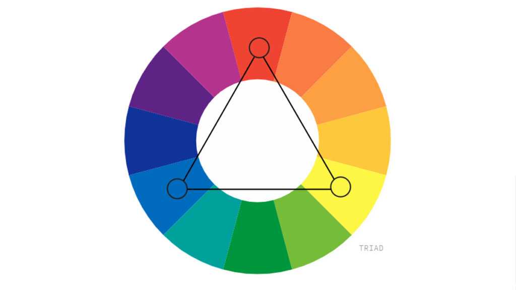 Классическая триада — это треугольник, который состоит из цветов, расположенных максимально далеко друг от друга на цветовом круге. Например, базовые цвета круга — красный, желтый и синий — это один из вариантов классической триады.