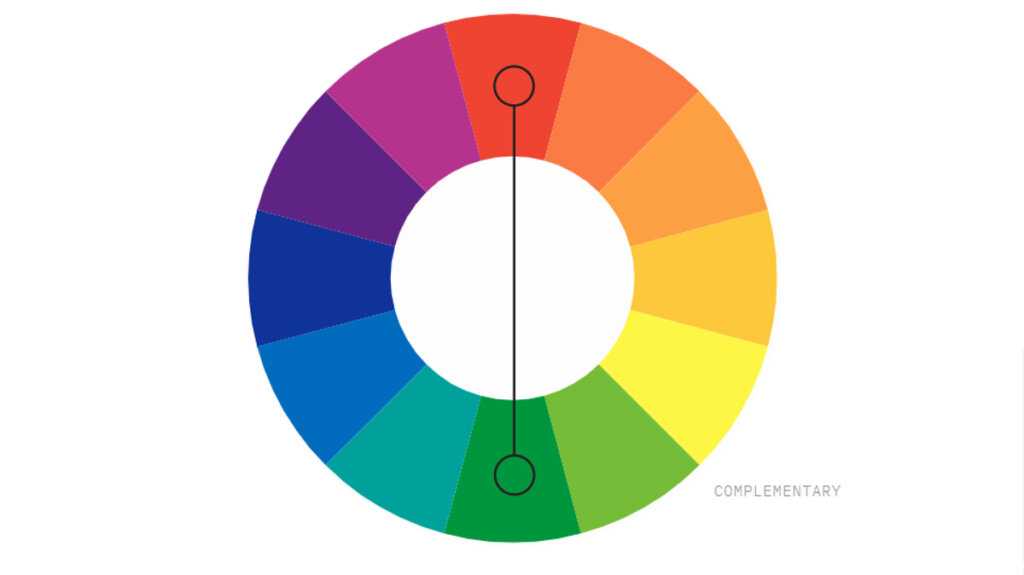 Комплементарные цвета — это цвета, противоположные друг другу на цветовом круге. Это самая сильная и эффектная цветовая схема, потому что она наиболее контрастная. Она хорошо запоминается.