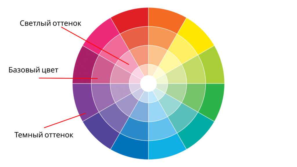 Оттенки одного цвета (или тона) варьируются в диапазоне от совсем светлых до совсем темных. При этом черный и белый технически не являются отдельными цветами и не включены в цветовой круг.
