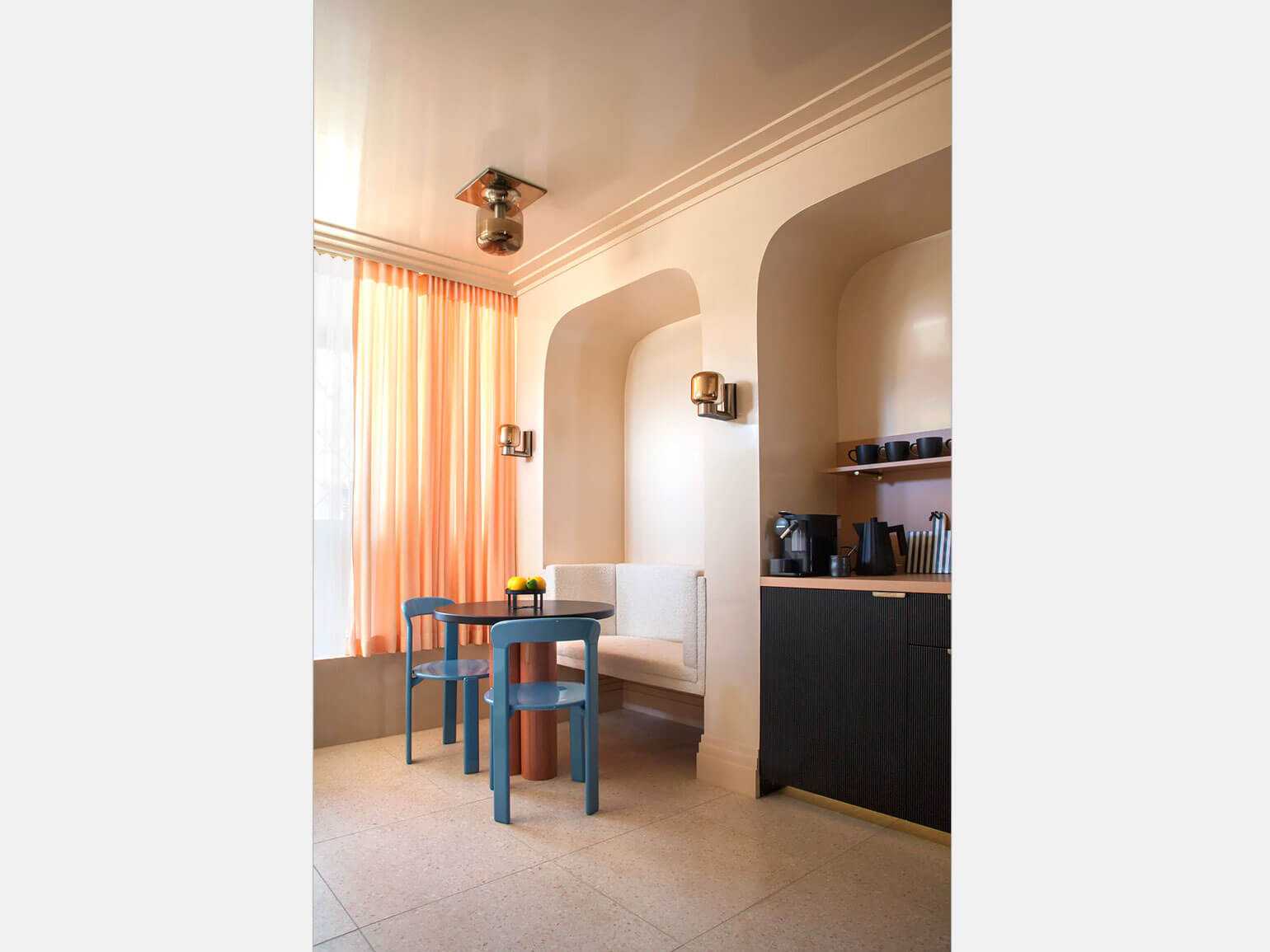 Предлагая теплые и жизненно важные акценты в остальном минимализм в цветах и формах, дизайнеры добились легкого и функционального декора для очень ограниченного пространства.