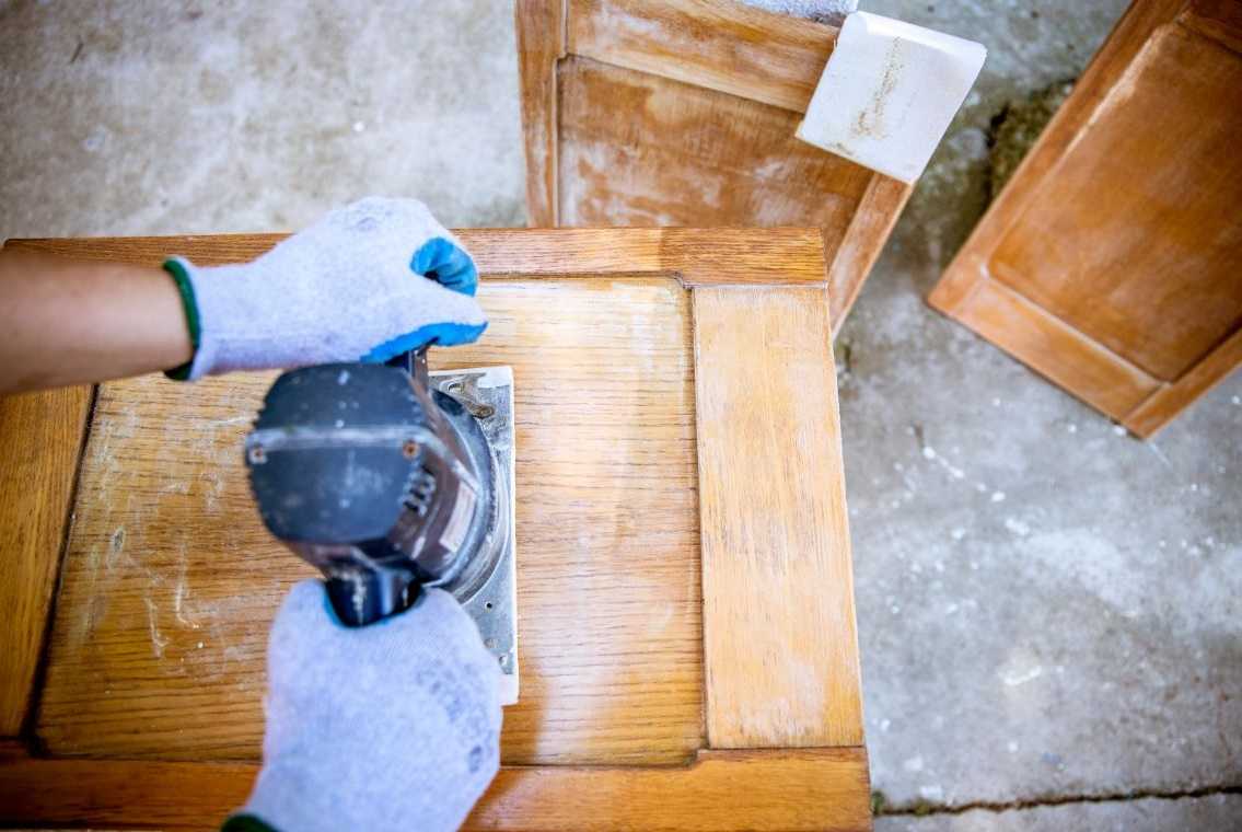 - При помощи наждачной бумаги необходимо отшлифовать деревянную поверхность, сняв предыдущее покрытие. После следует протереть стол сухой тряпкой перед тем, как его покрасить.