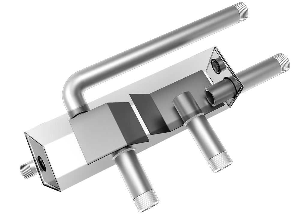 Распределительный коллектор монтируют после гидрострелки. Устройство состоит из двух независимых частей, которые объединяют перемычки. По количеству вторичных контуров врезают попарно расположенные патрубки.