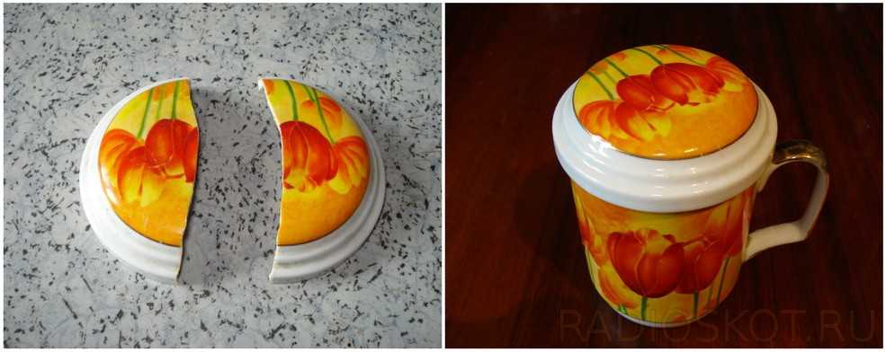В это же время, как нарочно, в очередной раз соскользнула на стол с заварочной кружки крышка и раскололась пополам (до этого падала регулярно и была цела). Клей справился и с керамикой. Только если хорошо приглядеться видно чуть заметный след от раскола.