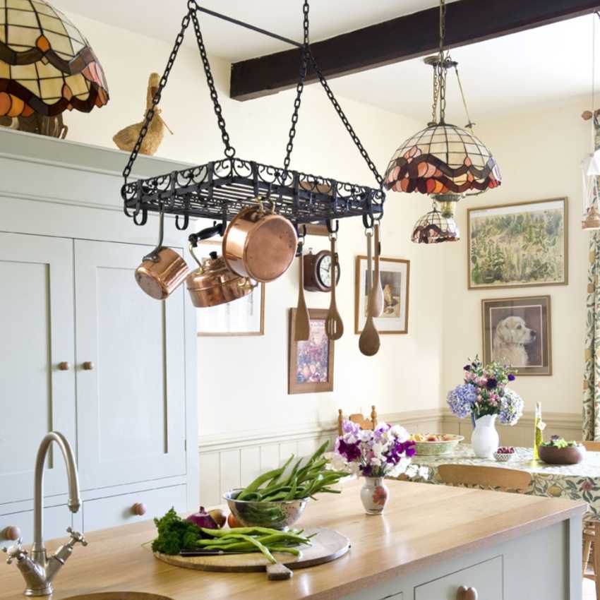 Подвесные системы рейлингов крепятся к потолку, благодаря чему могут выдержать вес тяжелых кастрюль и сковородок