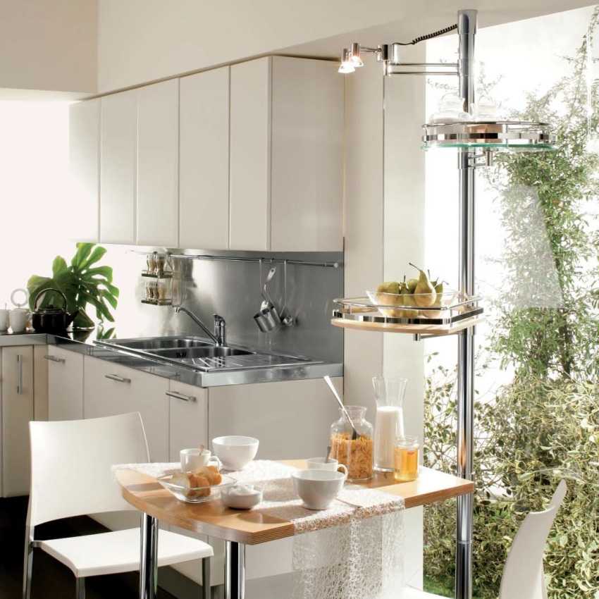Благодаря тому, что количество полочек и высоту их расположения можно изменять, всегда есть возможность подкорректировать дизайн конструкции. Более эргономичным является вертикальный рейлинг, который устанавливается по всей высоте кухни, а не просто упирается в ее столешницу.