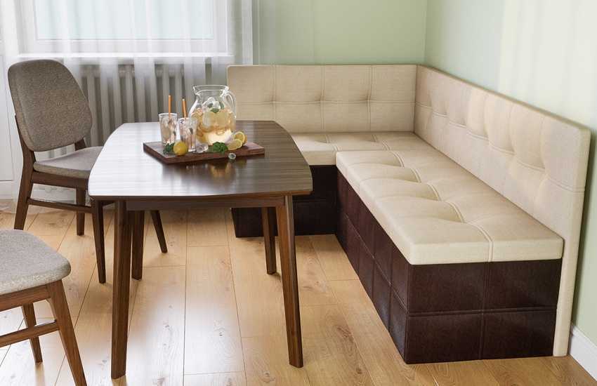 Лучшим вариантом кухонного гарнитура будет уголок с диванами, оснащенными ящиками для хранения вещей. Они должны быть просторными и удобно открываемыми. Следует учитывать, что ящики могут не позволить сидящим на диване людям расположиться с комфортом. Стоящие на полу короба не должны мешать ногам, поэтому их передние стенки рекомендуется делать скошенными или углубленными.