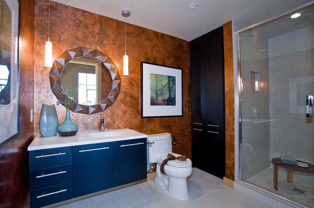 Еще одним достоинством стенового линолеума является его универсальность. Им можно оклеить полностью все стены или сделать декоративное панно на одной или нескольких ее частях. При желании этим материалом можно оформить лишь нижние поверхности стен, сымитировав панели. В ярко освещенной комнате можно использовать темные оттенки отделки, в то время как для маленькой ванны с недостатком света лучше поклеить линолеум светлого цвета.