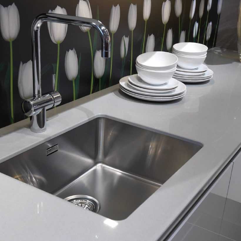 В небольшой кухонный гарнитур красиво впишется квадратная модель «Zigmund & Shtain Platz» из искусственного камня.