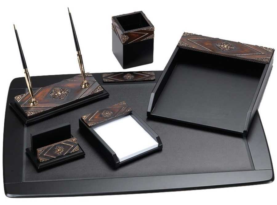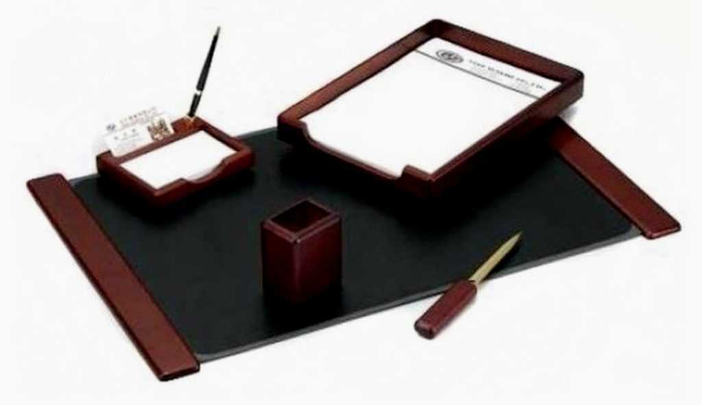 Этот недорогой набор предназначен для руководителя. Состоит из 5 предметов, которые обладают повышенной функциональностью. Для изготовления применяется красное дерево. Размер в разобранном виде составляет: 665х435 мм. Подставка для пишущих принадлежностей выглядит потрясающе, как и емкость для бумаг. Также следует отметить наличие визитницы и канцелярского ножа. Какие-либо декоративные вставки отсутствуют, но модель в этом не нуждается. Продукт от одного из лучших производителей станет отличным подарком для руководства.