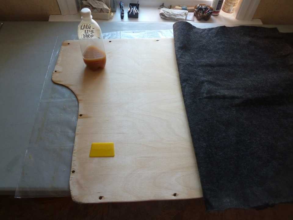 На фото – фанера, оклеенная карпетом. Аналогичным способом можно клеить и карпет, специальный материал для отделки и обтягивания поверхностей, в том числе и неровных. Он широко используется в отделке салона автомобиля, например для устройства сабвуфера.