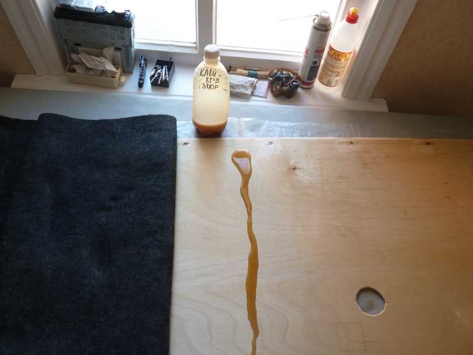 На фото – приклеивание поролона к фанере. Фанера, конечно, используется не только для устройства черновых полов или обшивки стены балкона или дачного дома. Широко применяется в производстве мебели, а также в автомобилях, например для устройства сабвуферов.
