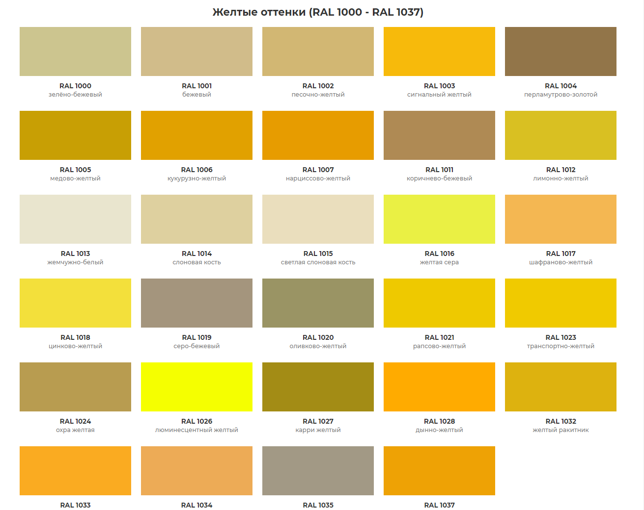 Оставшиеся 3 цифры – это порядковый номер оттенка в своей цветовой группе. Примеры колеров из зеленого диапазона – 6017 Майский зеленый, 6033 Мятно-бирюзовый; из желтого – 1015 Светлая слоновая кость, 1037 Солнечно-желтый.