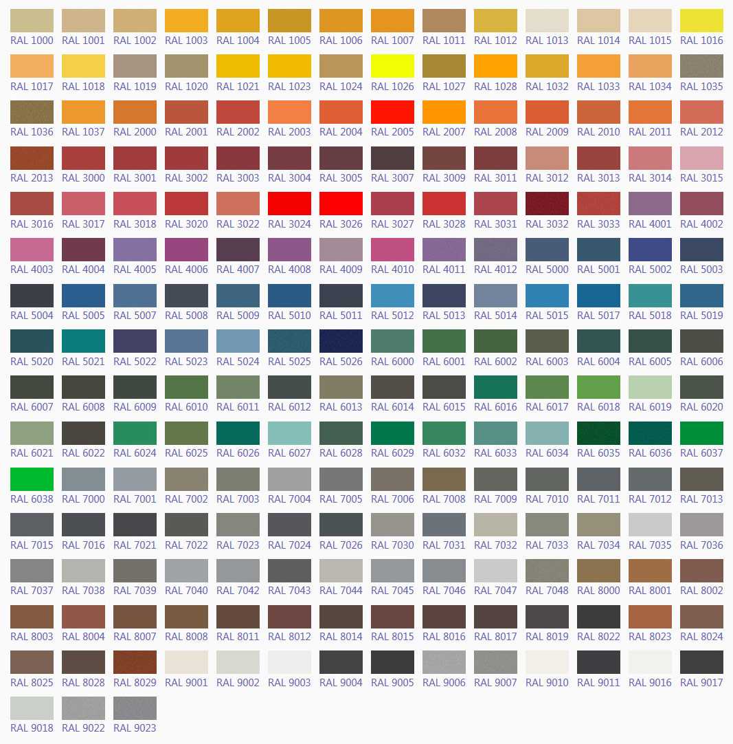 Полная палитра оттенков RAL широка и разнообразна. В неё входят различные комбинации, включенные в каталоги электронного и печатного вида.