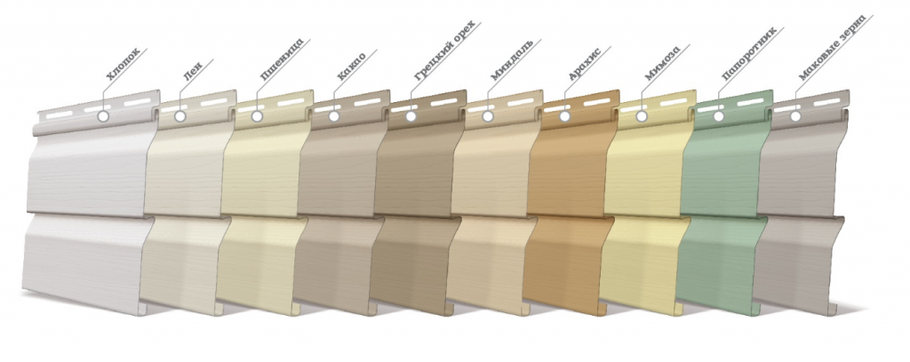 Основные панели винилового сайдинга отличаются в основном только цветом, см рисунок ниже. У разных производителей могут быть различия в длине и ширине, а также форме поверхности, но принцип крепления у всех одинаковый.
