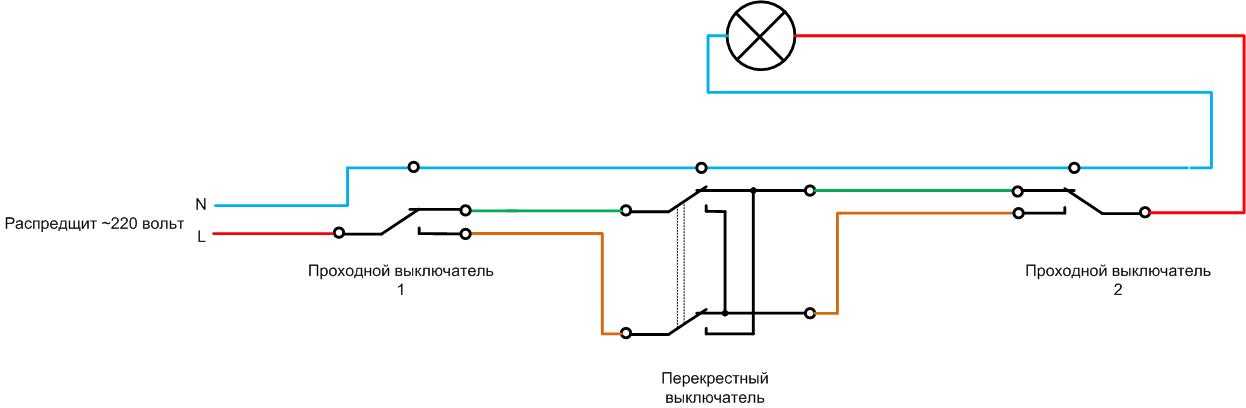 При таком подключении крайние коммутаторы работают по схеме двух точек, но включение света также зависит от положения проходного переключателя. Принципиальное отличие от двухточечной системы — свет зажигается не только в том случае, когда крайние выключатели находятся в разных положениях. Проходной коммутатор перенаправляет фазу от верхнего контакта входного выключателя на нижний контакт выходного, и наоборот. Для наглядности изобразим фазный провод разными цветами: