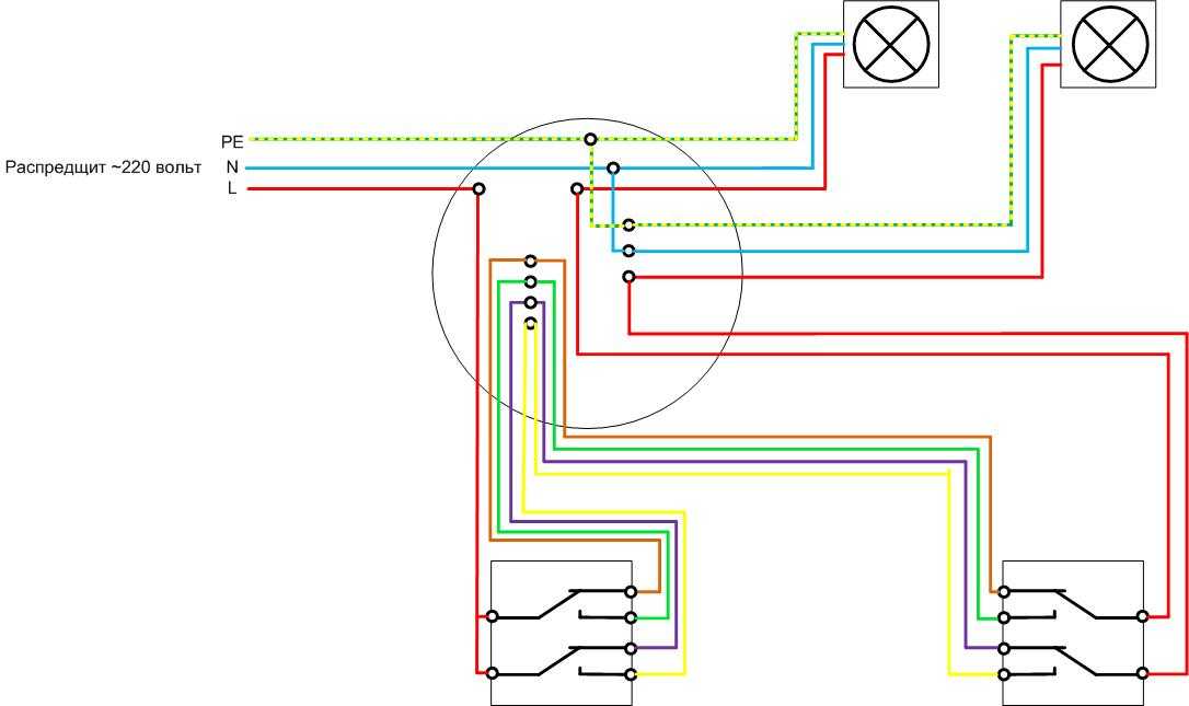 Принципиальная схема подключения проходного выключателя с 2-х мест