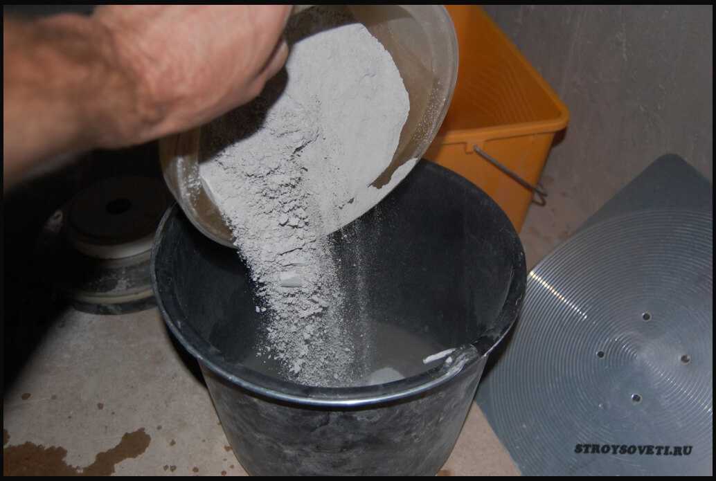 - Вначале изучаем инструкцию и замешиваем раствор в ведре или любой другой емкости, точно соблюдая указанные пропорции воды; смесь должна быть промешана идеально и не иметь даже мельчайших комочков;