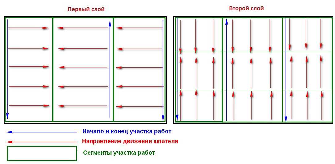 - При нанесении первого слоя стартовым материалом применяется широкий шпатель, который следует держать под углом 30 градусов к плоскости. Стартовый раствор готовится небольшими порциями (чтобы мастер успел полностью использовать материал, пока он не потеряет своей эластичности). При его нанесении на поверхностях будут оставаться полосы (бороться с ними не имеет смысла, так как они легко убираются при нанесении второго финишного раствора).