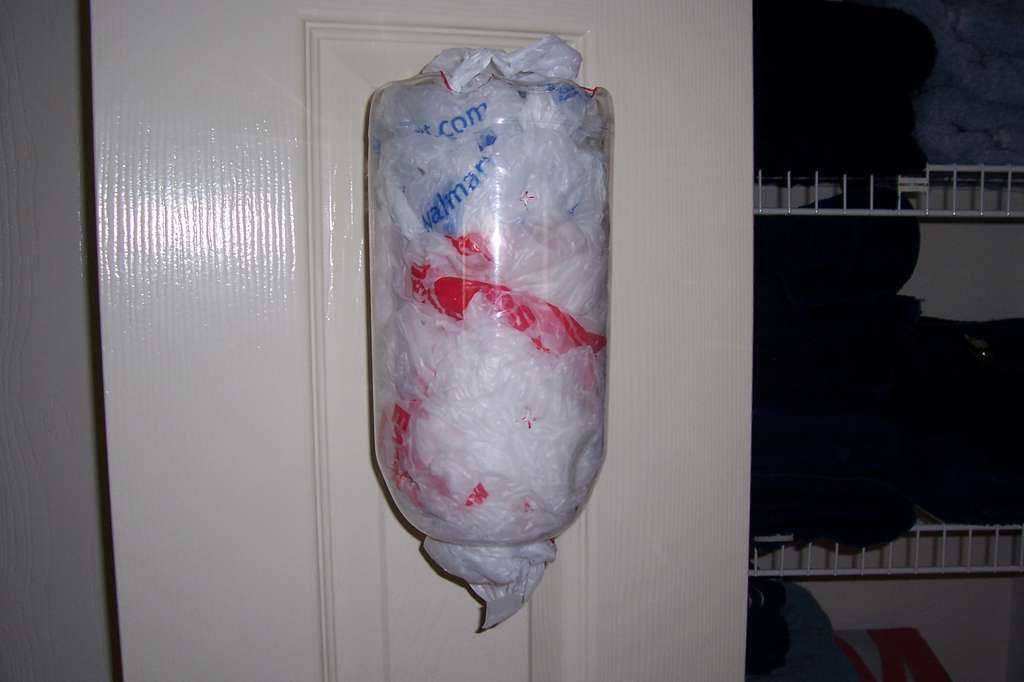 Не менее компактным хранилищем для кульков считается пластиковая бутылка. Ее принцип работы такой же, как и в предыдущем случае. После извлечения одного пакета автоматически достается следующий. Чтобы из обычной бутылки сделать удобное место для хранения упаковочного материала, подготовьте двухлитровую пластиковую бутылку.