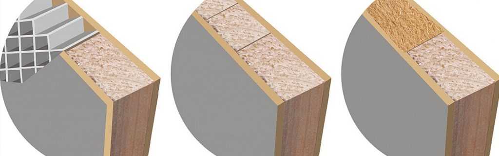 - Конструкции из ДСП, МДВ и других полусинтетических материалов, могут иметь толщину от 30 до 50 мм, в зависимости от типа внутреннего наполнителя.
