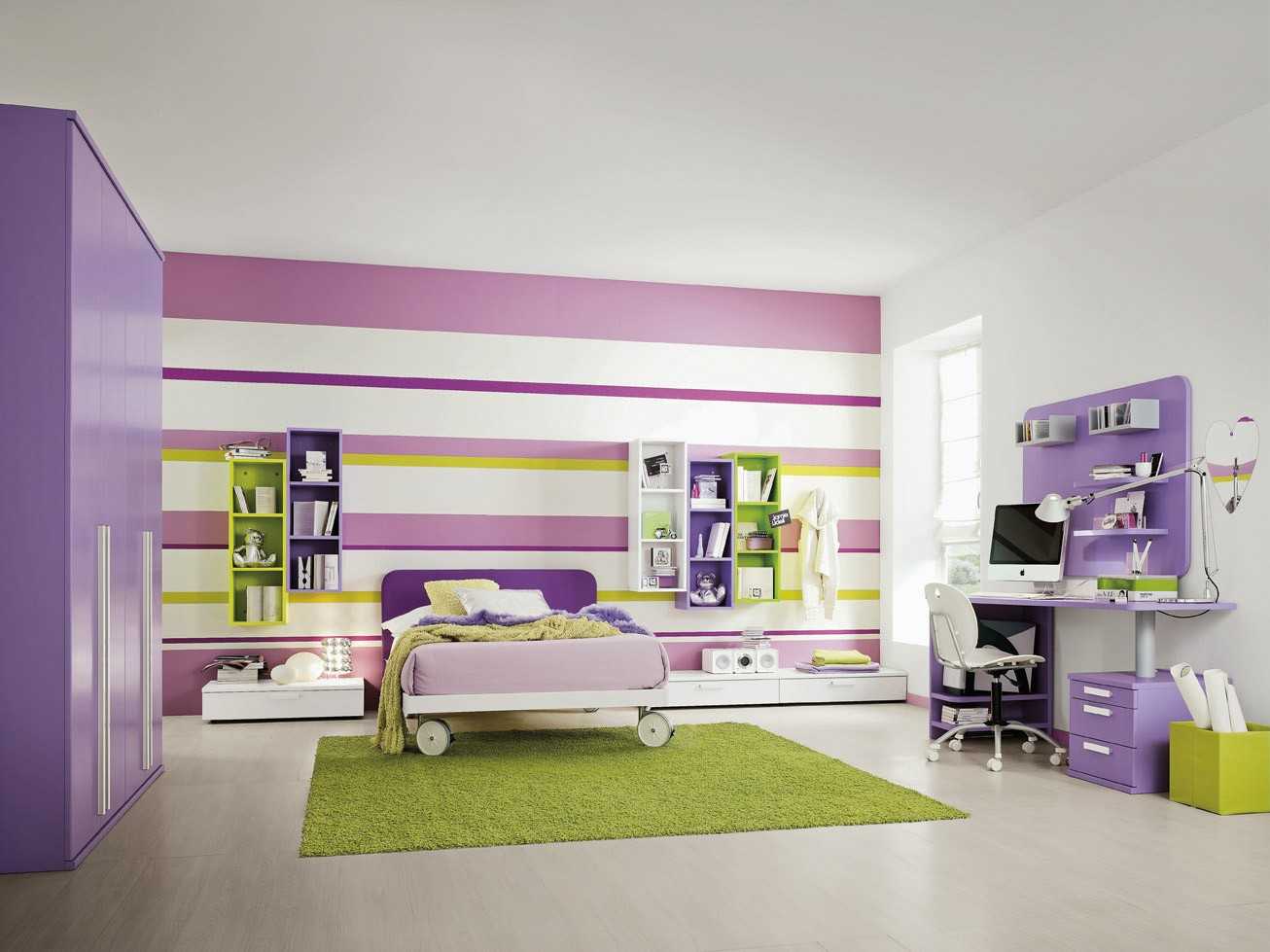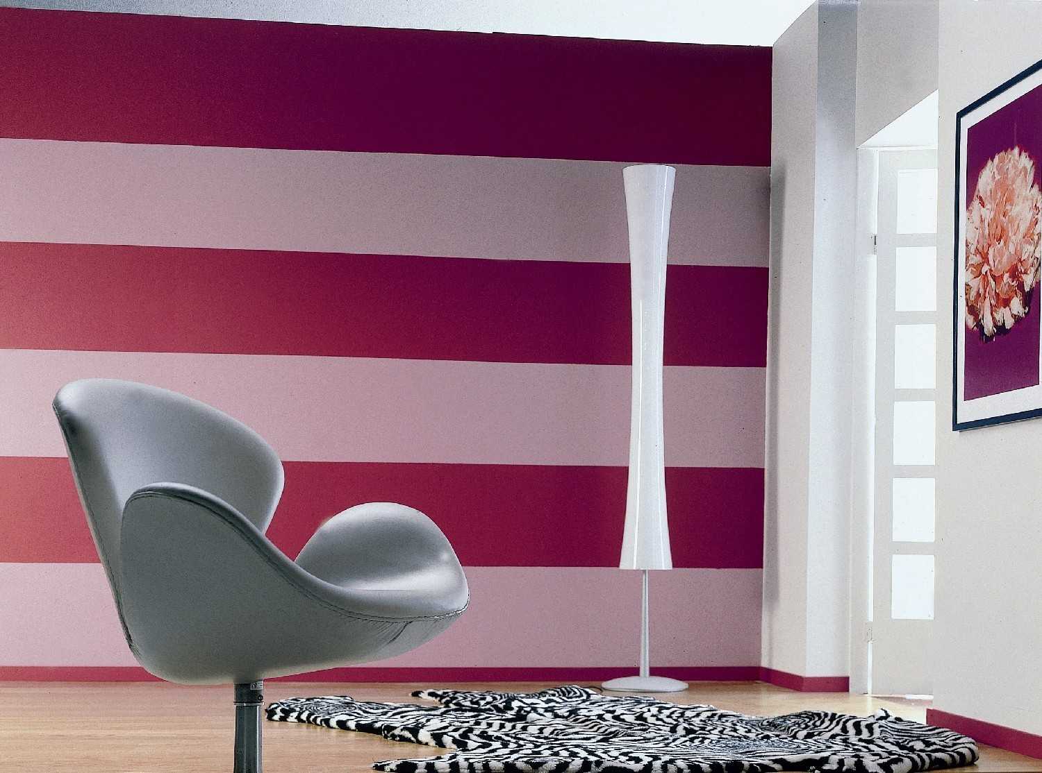 Достаточно использовать два-три тона и стена легко превращается в полосатую. Нужно сказать, что процесс этот довольно трудоемкий, но результат стоит потраченного времени. Проще всего делать широкую полосу – в этом случае потребуется меньше работы со скотчем, да и результат будет выглядеть аккуратнее. Широкая полоса выглядит мягче, чем узкая.