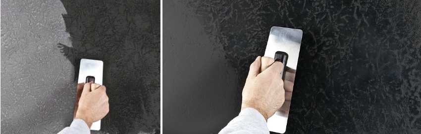 Шпателем выхватывают небольшую часть смеси и распределяют ее начиная с правого нижнего угла. Инструмент держат под углом 60°, обрабатывают стену рядами по вертикали или горизонтали. Смесь растягивают до образования такого слоя, чтобы была возможность для создания борозд и царапин.