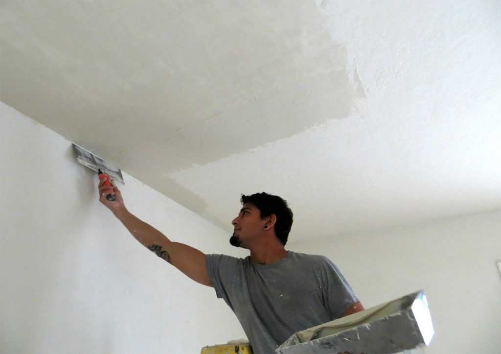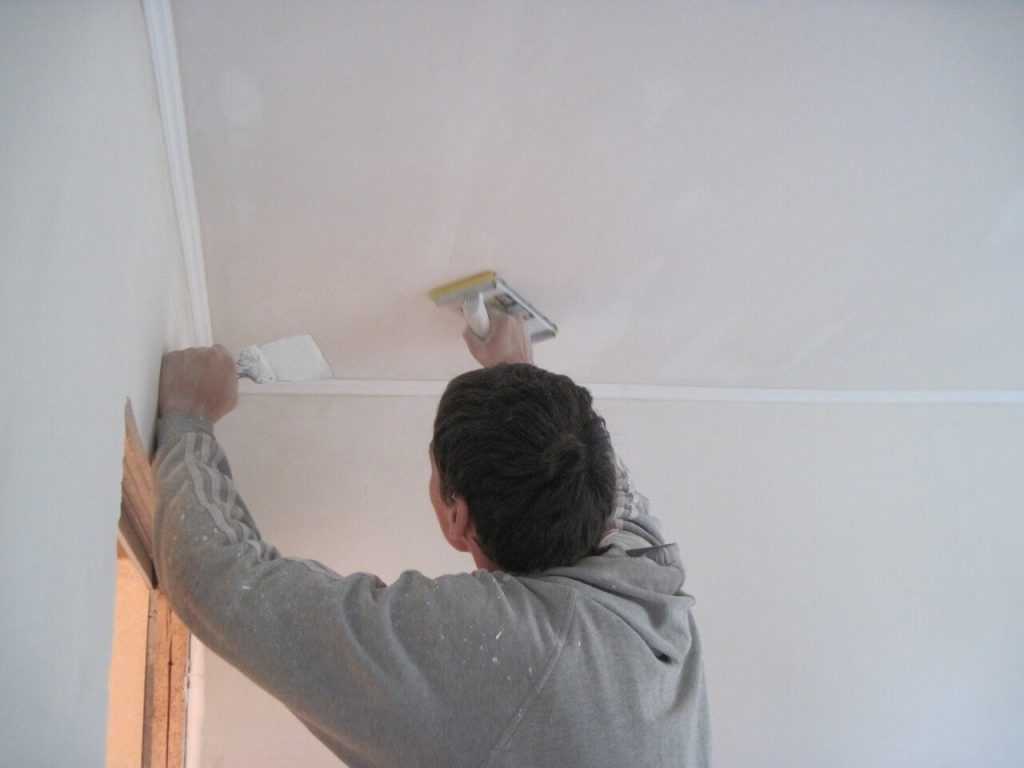- Выравнивание поверхности с помощью нанесения слоя шпаклевки (идеально использование сначала стартовой, а затем финишной). Перед шпатлеванием потолок необходимо также обработать грунтовкой.
