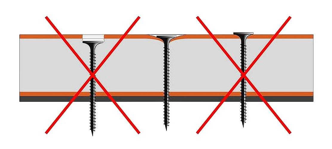 Сначала проверяется качество вкручивания саморезов. Торчащие шляпки утапливаются в верхний слой листа, а слишком утопленные извлекаются и вкручиваются новые саморезы не ближе чем в 50 мм от прежнего места.