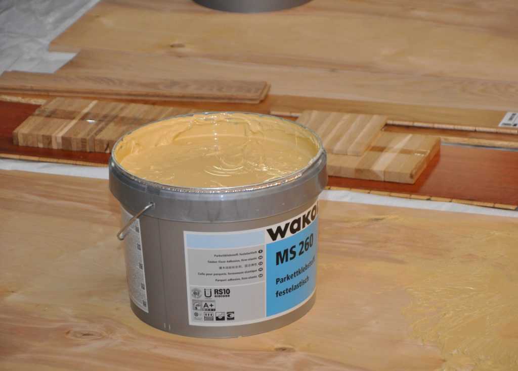 - Двухкомпонентный – состоит из двух частей (непосредственно клеящий состав и отвердитель). Применяется для фиксации пиломатериалов на разные виды оснований, бетонную стяжку в том числе. Только этот состав можно использовать с целью супернадежной фиксации фанеры к бетону и без страховки дюбелями. Они стоят дороже остальных клеев, используются после приготовления в течение 50-60 минут (а потом становятся непригодными, так как завершается процесс полимеризации).