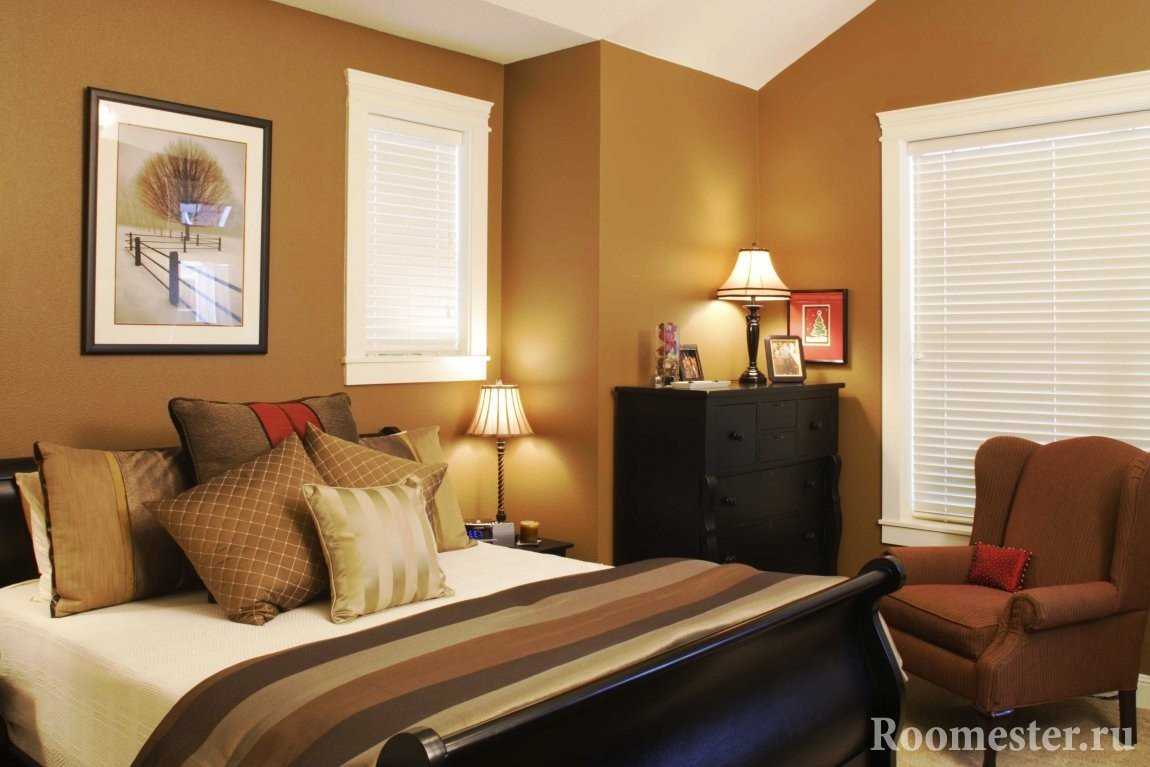 желтый. Спальня, оформленная в желто-коричневых тонах, будет выглядеть живой и солнечной. Такая обстановка будет способствовать веселому и хорошему настроению. Чтобы не допустить агрессивности в дизайне, обязательно нужно использовать декор темного цвета. Оригинально смотрится желтая стенка, возле которой устанавливается темная мебель.