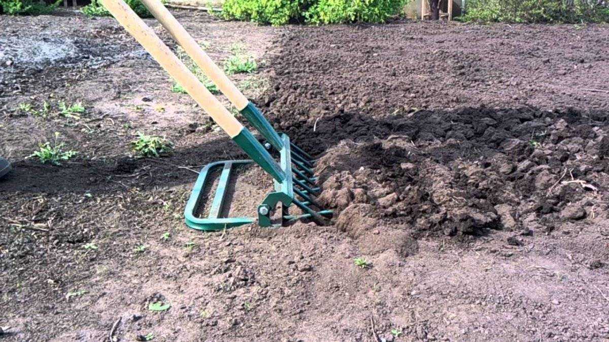 - Зубья вонзаются в землю, и черенок тянется назад. Вилы поднимают пласт грунта, проходящий сквозь вторые вилы и измельчаемый там.