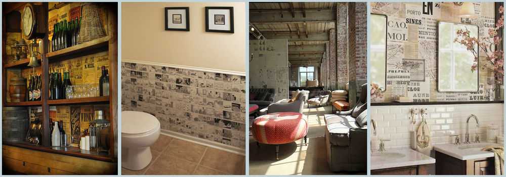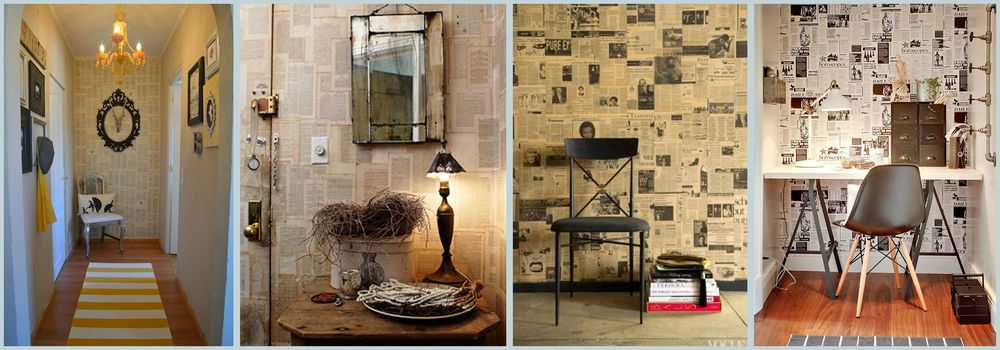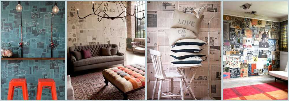 Когда-то газеты клеили на стену. Их использовали для выравнивания поверхности стены перед оклейкой обоями. Теперь газеты могут быть самостоятельным декором стены, пола, мебели. Использование «старого» винтажного изображения газет, журналов, нот, вывесок становится очень популярным приёмом в декорировании. Обои, ткани, напольное покрытие, керамическую плитку – всё это можно спокойно найти в продаже. Но вполне можно обойтись и тем, что есть и сохранилось у Вас в доме. Старые постеры, журналы, газеты, учебники, сборники нот, справочная литература и даже различные ведомости можно использовать для разного декора. Правда современные обои клеить несравненно легче, чем старые газеты, но аккуратность и терпение помогут и в этом не хитром деле.