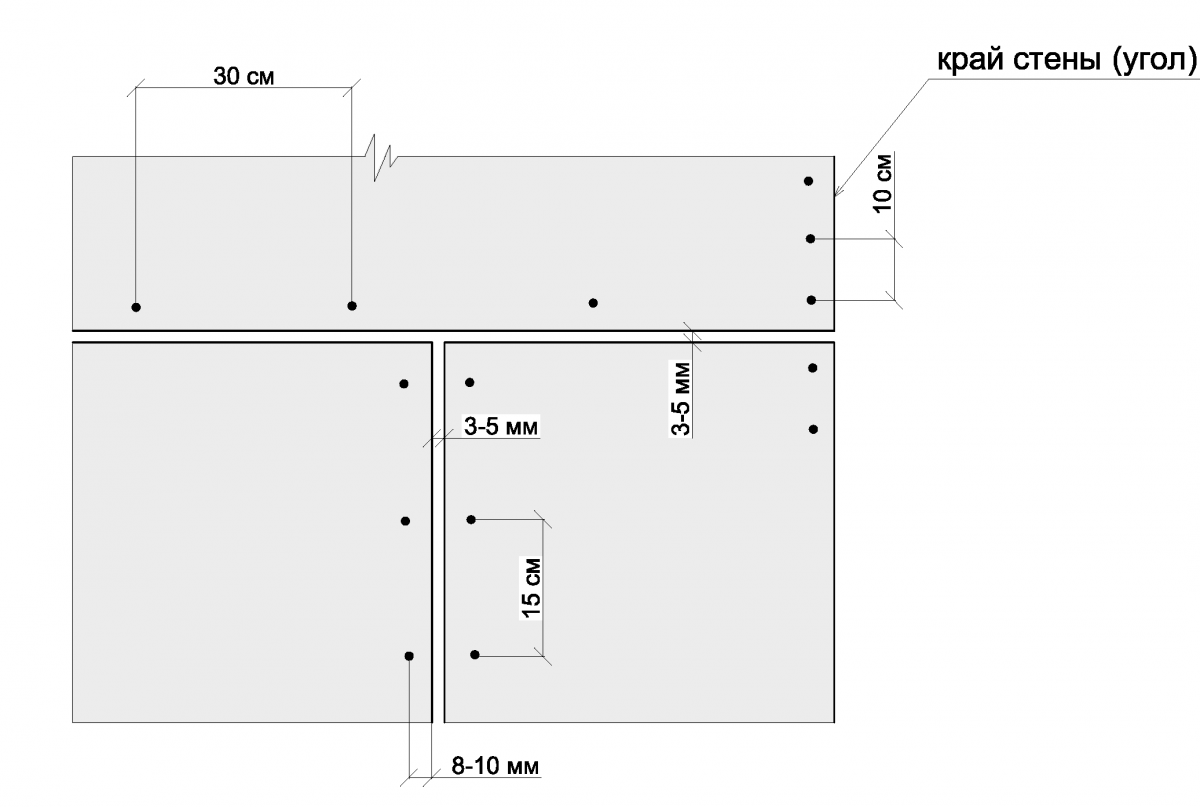 - места стыков плит материала обработать специальной армирующей лентой, чтобы предотвратить образование трещит и сколов в этих местах;