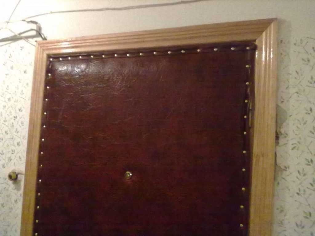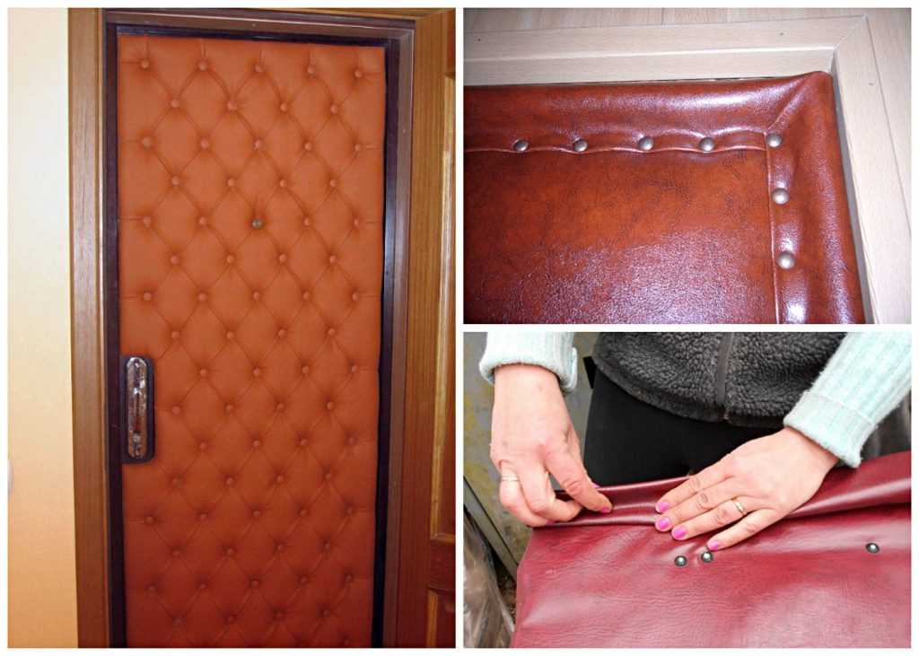 Ещё одним популярным способом облагораживания входной двери является обивка полотна кожей, дерматином с мягким наполнителем. Такая поверхность обеспечивает уют, способствует сохранению тепла, препятствует распространению вибрации, легко моется и служит десятки лет, при условии бережного обращения.