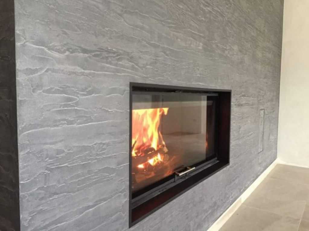 Отделка очага штукатуркой — процесс несложный и недорогой. Подходит для построек полностью из кирпича, бетона. Такая конструкция не утяжеляет объект; следовательно, в дальнейшем укреплении фундамента нет необходимости. Штукатурный слой, предназначенный для последующей отделки, немного отличается от декоративного варианта. При изменении дизайна интерьера легко перекрасить в другой цвет, соответствующий цветовой обстановке. Минус такой отделки — при нанесении толстого слоя требуется армирование, а также длительная сушка.
