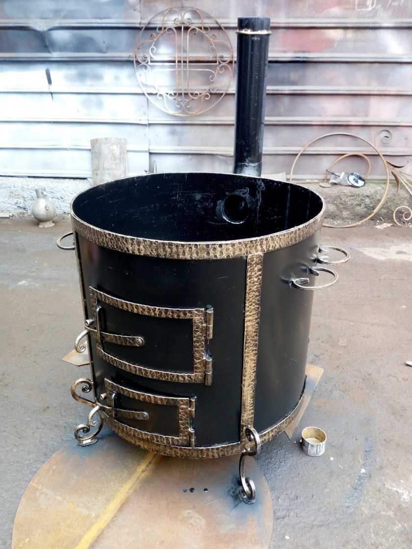 Печь, предназначенная для приготовления кулинарных изысков в казане со стороны, напоминает цилиндр. В качестве опоры для основы должны быть массивные ножки, чтобы они могли выдержать массу казанка с едой в нем.