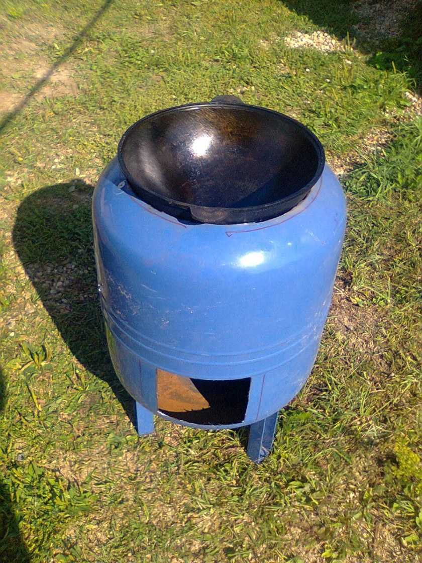Диски совмещаются соосно и соединяются с помощью сварки. Нижняя перегородка играет роль колосника. Полость двух дисков является топкой. Остается только вырезать в боковой части отверстие для дверцы, приварить ручки, ножки и самодельным устройством можно пользоваться.