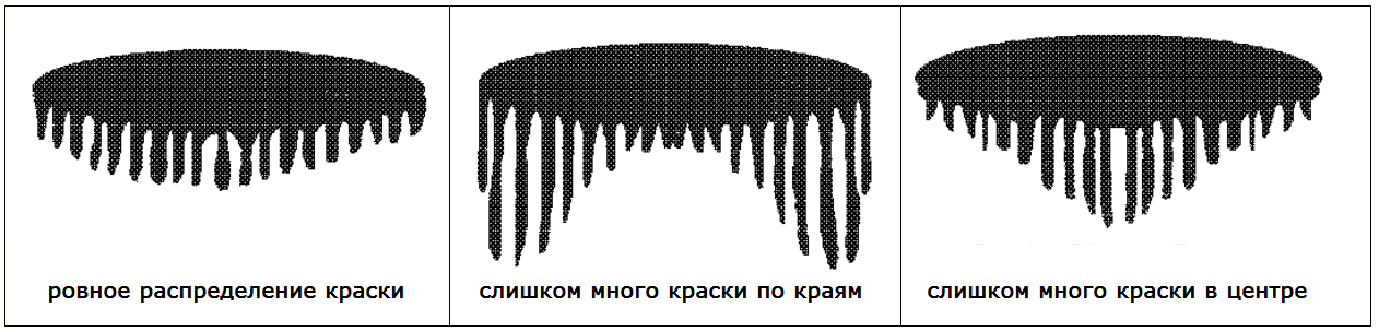 Для качественной и эффективной покраски материал должен распределяться равномерно или с незначительной концентрацией в центре факела. Образцы правильного и неправильного распределения материала приведены ниже.
