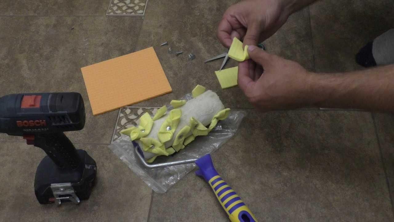 Если нужен конкретный узор, в качестве основы берётся инструмент с гладким резиновым цилиндром. Фигурки вырезаются из листа плотной резины толщиной 0,5-1 см, и наклеиваются на валик. Более простой способ — нанести на вал рисунок из клеевого пистолета.
