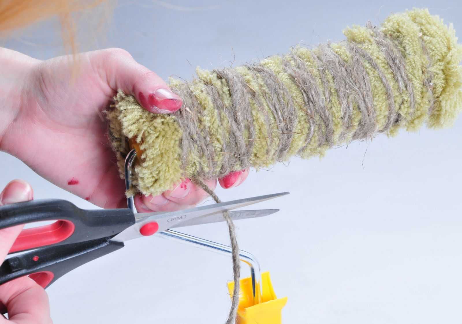 Модифицировать малярный инструмент можно обвязав его лоскутами ткани. Если намотать на цилиндр инструмента грубую верёвку, также получится специфический узор. Чем чаще она накручена, тем более интенсивным будет узор на стене.